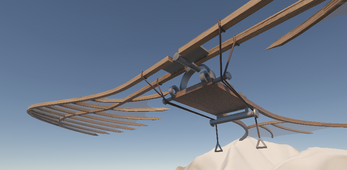 The Winged Flying Machine: invented by Leonardo Da Vinci and created in Blender + imported in Unity by some existing CreaTe student. Please follow the path on the ground that leads to a very bald spot, because here the magic happens.:The machine will start moving~! It will make a full circle around you (if you stay there that is, but you could also run after it) and stops when its path is finished. Walk around in the meantime and come back a bit later to make it all happen again :)